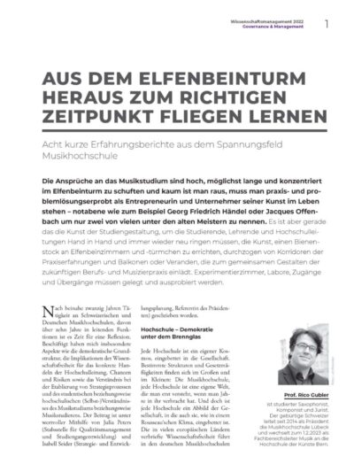 Die Ansprüche an das Musikstudium sind hoch, möglichst lange und konzentriert im Elfenbeinturm zu schuften und kaum ist man raus, muss man praxis- und problemlösungserprobt als Entrepreneurin und Unternehmer seiner Kunst im Leben stehen – notabene wie zum Beispiel Georg Friedrich Händel oder Jacques Offenbach um nur zwei von vielen unter den alten Meistern zu nennen. Es ist aber gerade das die Kunst der Studiengestaltung, um die Studierende, Lehrende und Hochschulleitungen Hand in Hand und immer wieder neu ringen müssen, die Kunst, einen Bienenstock an Elfenbeinzimmern und -türmchen zu errichten, durchzogen von Korridoren der Praxiserfahrungen und Balkonen oder Veranden, die zum gemeinsamen Gestalten der zukünftigen Berufs- und Musizierpraxis einlädt. Experimentierzimmer, Labore, Zugänge und Übergänge müssen gelegt und ausprobiert werden.